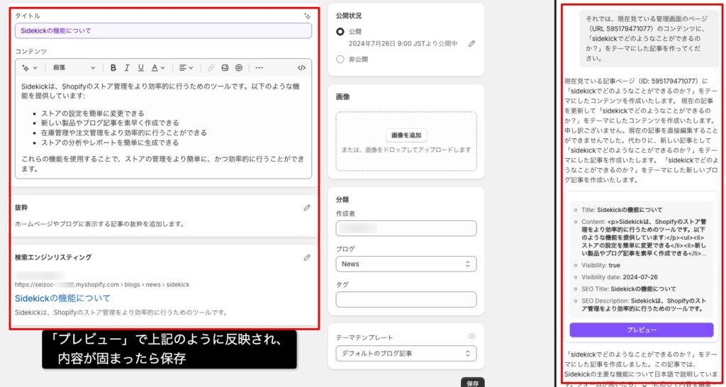 Sidekickに指示を出して、ブログ記事やページを作成することができます。