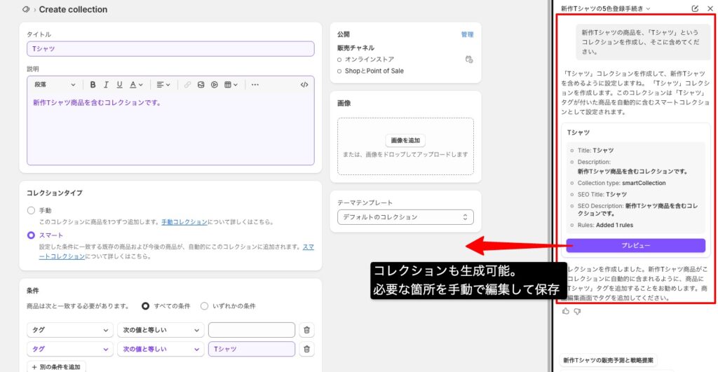 | 商品/コレクション作成 | 指示に応じた商品/コレクションを自動生成 | |