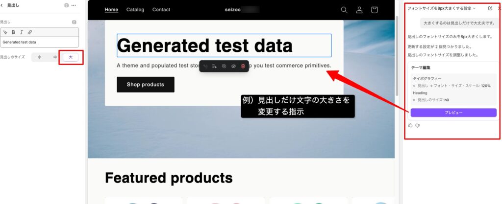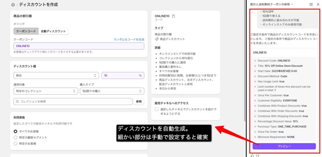 例えば「商品が10%OFFになるクーポンコードを作って」と入力すると、割引コードを自動生成し、条件まで設定してくれます。プレビュー画面で、設定した箇所を紫色の枠でハイライトしてくれるので内容確認も容易です。