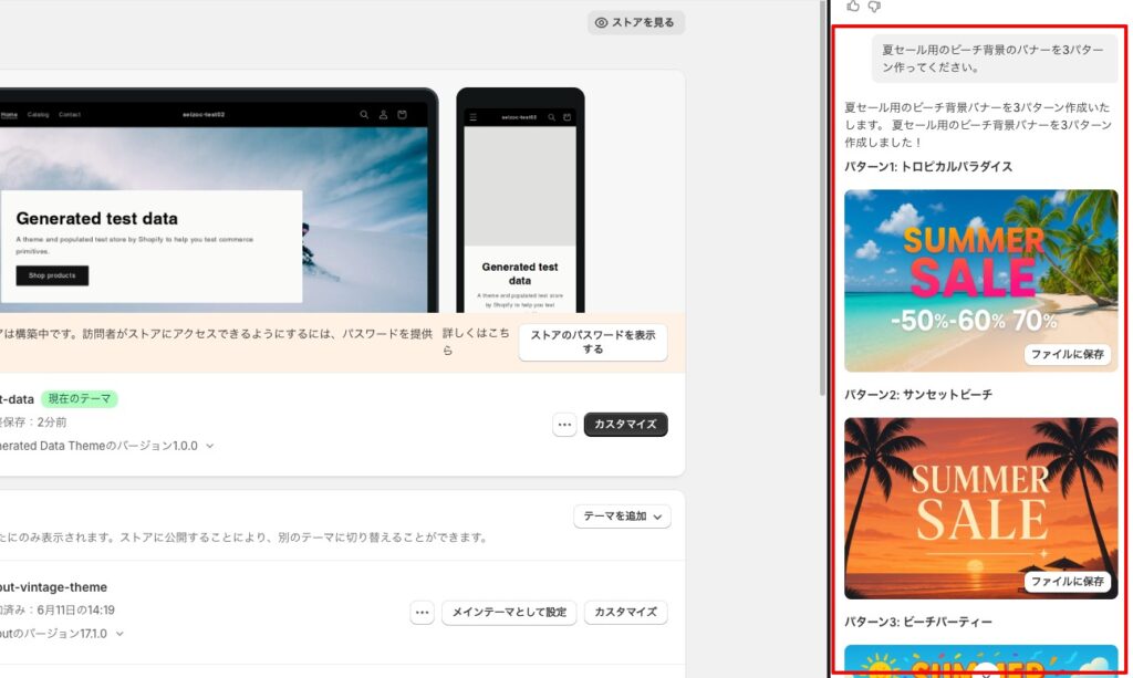 例えば「夏セール用にビーチを背景にしたバナーを作って」と指示すると、最大で5案を生成してくれます。品質に問題がなければ、そのまま「ファイル」に保存することもできます。画像作成の工数軽減が期待できます。