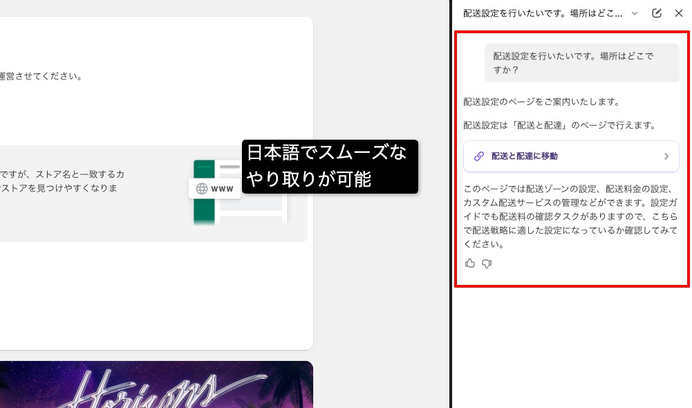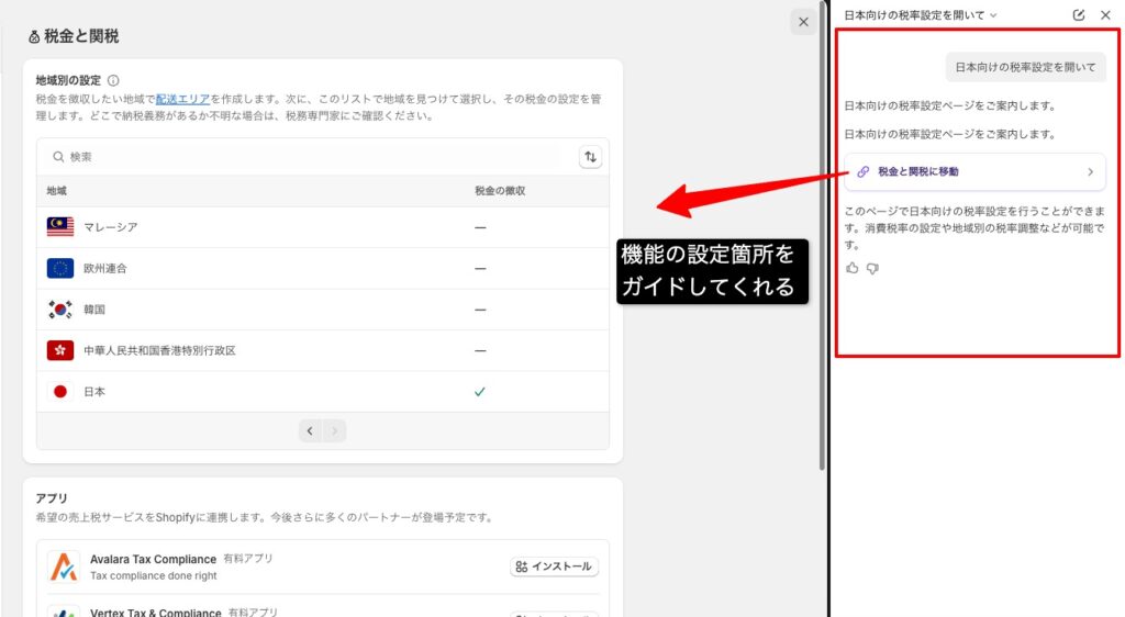 例えば「日本向け税率設定を開いて」と入力すると該当ページへの導線案内や設定手順をサポートしてくれます。税率設定だけではなく、管理画面での設定項目について不明点がある場合は、聞くと丁寧に案内してくれます。