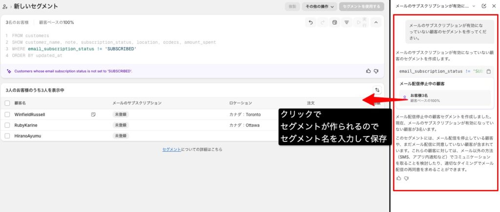 顧客を抽出したり、メルマガ配信を行う際などに重宝するセグメント機能ですが、こちらもAIにお願いすることができます。セグメントの条件を伝えるだけで自動生成してくれるので非常に便利です。